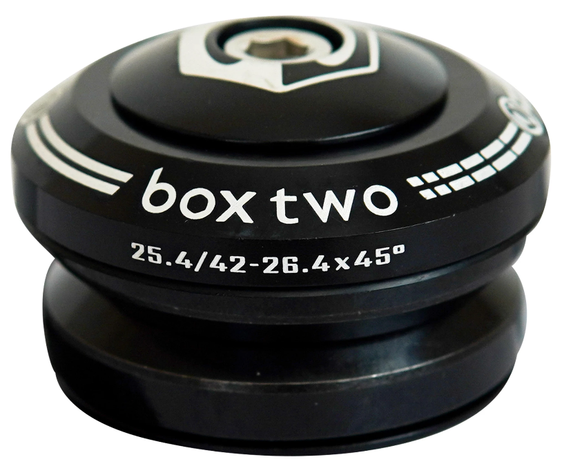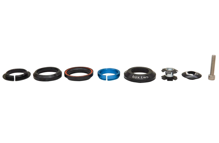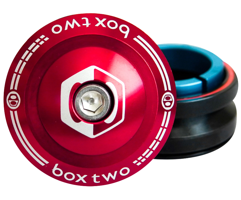The Box Two 1" Integrated Conversion Headset features an aluminum top cap, CNC-machined bearing cover, and split crown race with super-smooth rolling, precision 45x45 bearings.