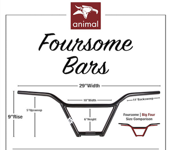 The Animal Foursome bars give you that older GT BMX 4 piece bar look but with fully updated modern specs. They are made of post weld heat treated chromoly tubing and are butted to add strength in high stress areas yet keep them lightened up a bit.