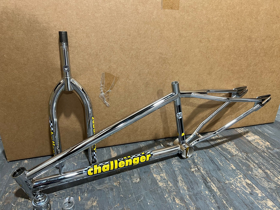 The S&M Challenger Frame & Fork Kit includes a frame, fork, headset, seat post clamp, and a seat post. USA Made in SoCal by the rad dudes at S&M Bikes in 2022. Live your Mid School BMX dreams again!
